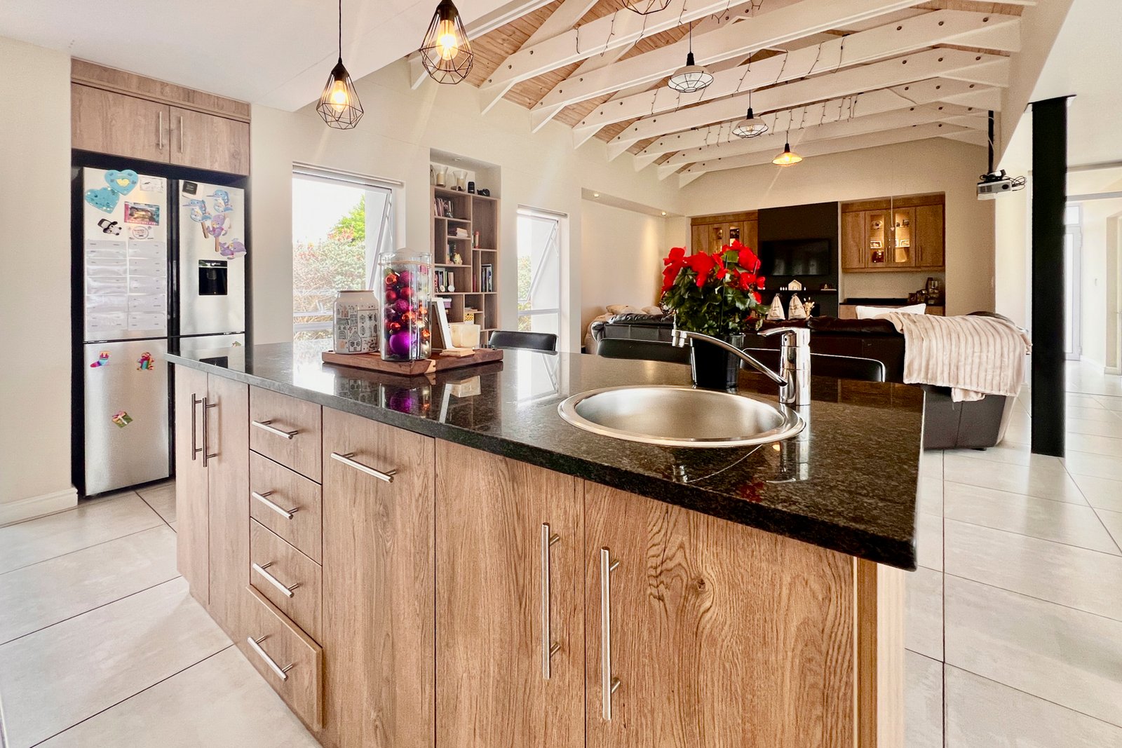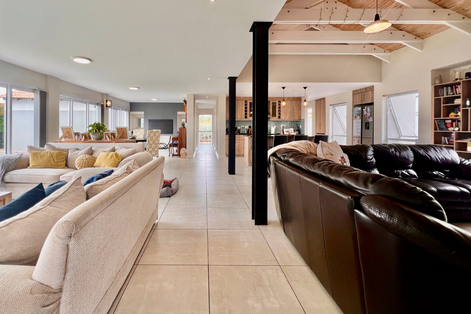 Experience seamless flow in the expansive open-plan design, complemented by double-volume ceilings and charming exposed beams.