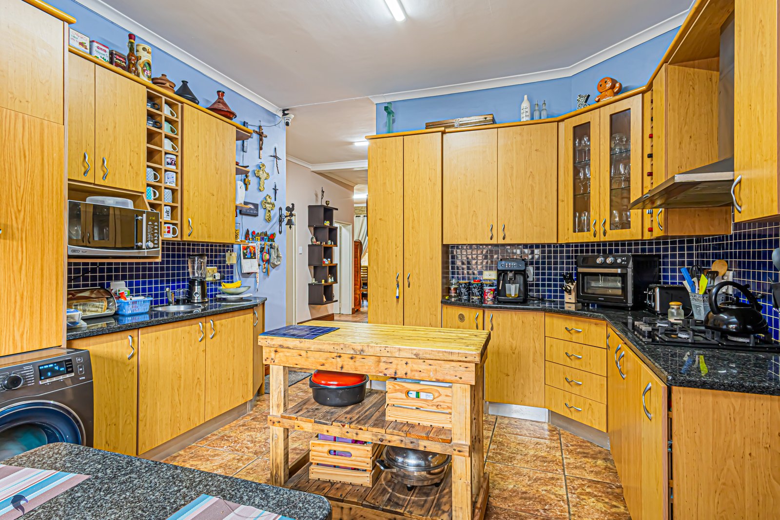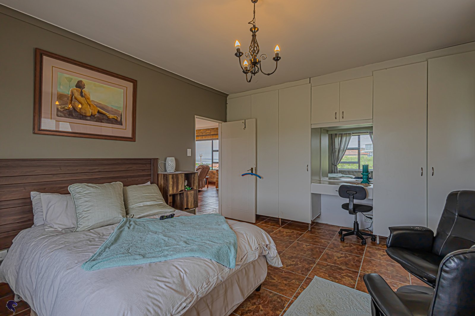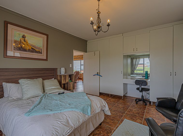 Downstairs, the home welcomes you with a warm and inviting reception area that includes an indoor braai — ideal for entertaining all year round. The open-plan kitchen is well laid out with a separate scullery, while a study, guest toilet, and a ground-floor bedroom provide flexible living options for guests, extended family, or working from home.