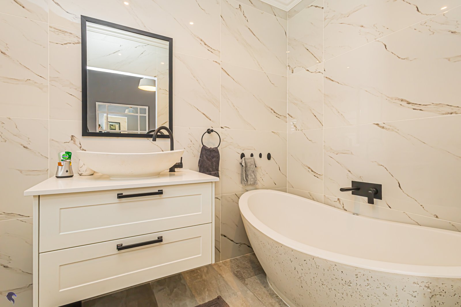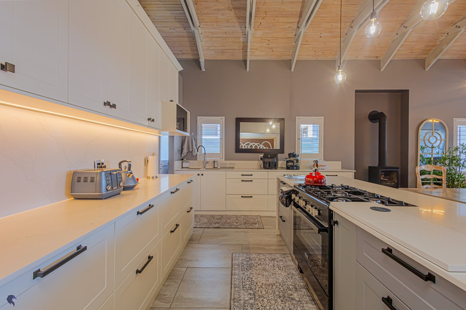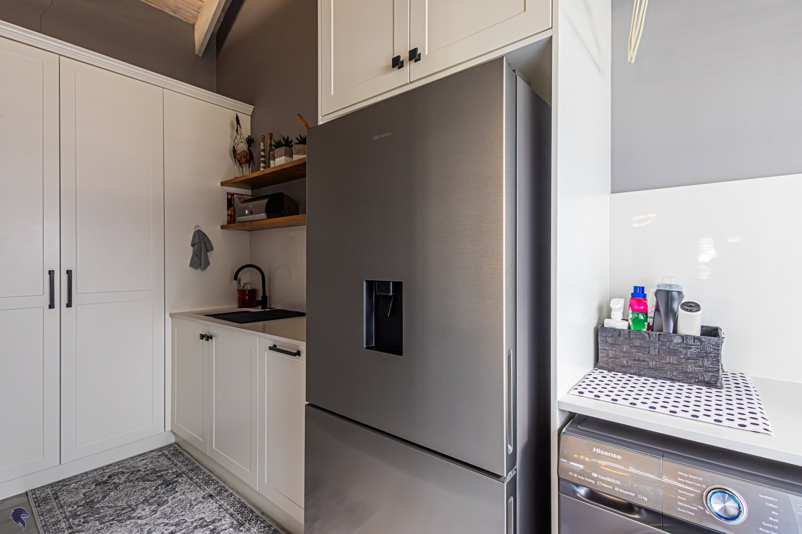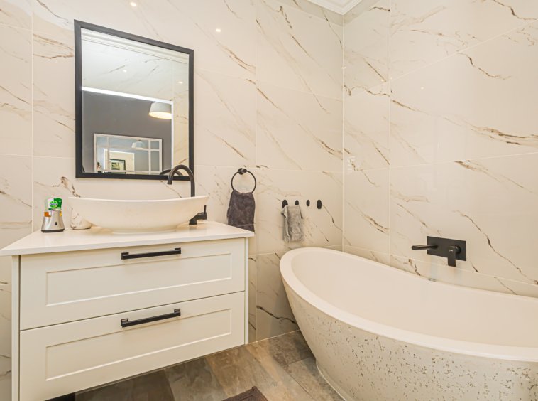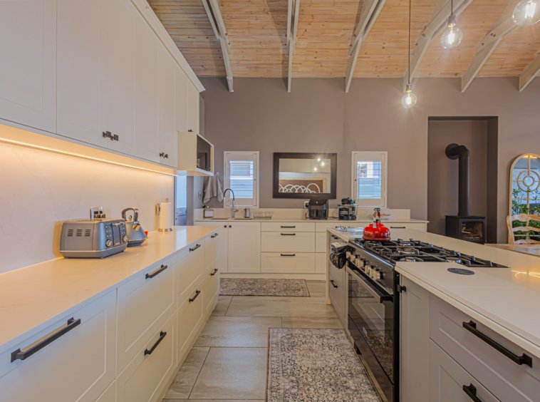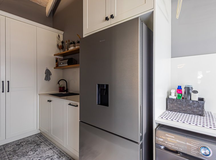 Not your stock standard run of the mill finishes, because the modern French-style EGGER wood kitchen is a total standout — light, charming and beautifully finished — with a separate scullery to keep the mess out of sight when you’re entertaining. The LED under counter strip lights light up your way effortlessley at night. The waterfall centre island with soft grain is just begging for some friends to sit around it and enjoy laughter and social connection.